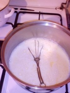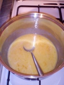 Ha felforrt,folytonos kevergetés mellett a tojássárgás alaphoz adjuk.Kis lángon besűrűsítjük.