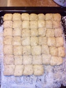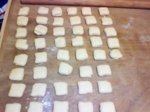 Letakarjuk,30-40 percet kelesztjük.Ha megkelt,nyújtsuk ki 1-1,5 cm vastagságúra,és kisebb pogácsaszaggatóval vagy bármilyen formával szaggassuk ki a tésztát.