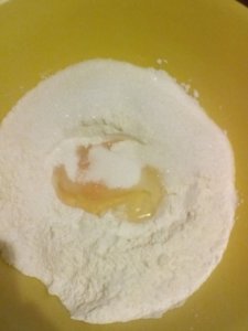A liszthez adjuk a cukrot,sót,vaníliás cukrot,tojást és az olvasztott margarint.