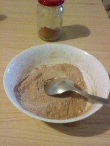 3 ek porcukrot szitáljunk egy kisebb tálba,és adjunk hozzá 2 ek fahéjat.