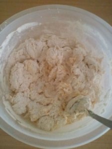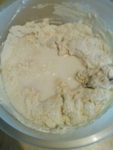 Majd a felfuttatott élesztőt is,és kicsit keverjük össze.