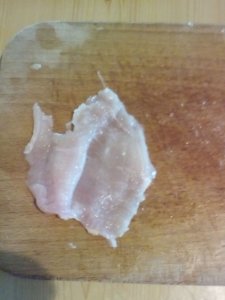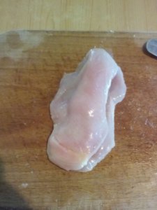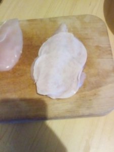 Egy csirkemellet lehetőség szerint,2-3 szeletre vágjunk.