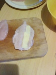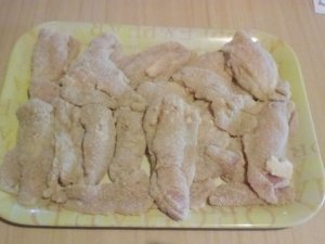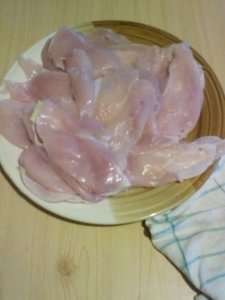 A húst mossuk meg,tisztítsuk meg az esetleges zsíroktól,hártyáktól.Szeleteljük el a csirkemelleket hosszában.