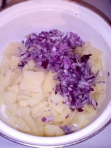 Majd hozzáadjuk a héjától megtisztított,tetszés szerint felvágott lilahagymát,és jól összekeverjük.