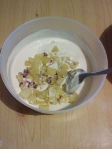 Jól átkeverjük az egészet.Szükség esetén sózzuk,porcukrozzuk.