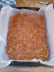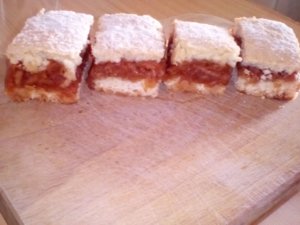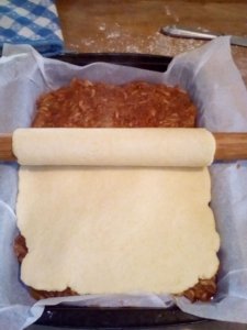 *A töltelék ráhelyezése előtt megszórhatjuk zsemlemorzsával,darált keksszel vagy akár darált dióval is.