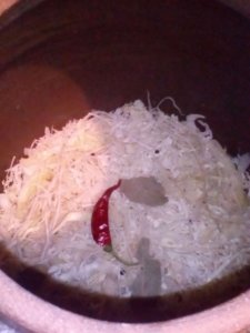 A cseréphordó aljára tegyünk 2-3 marokkal a gyalult káposztából,majd jól nyomkodjuk le.