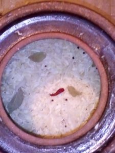 3-4 nagy csipet sóval szórjuk körbe a cserépedénybe tett káposztát,majd adjuk hozzá a fűszereket egyenletesen eloszlatva: