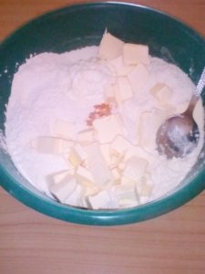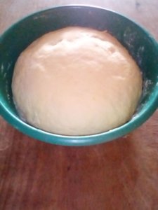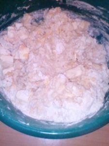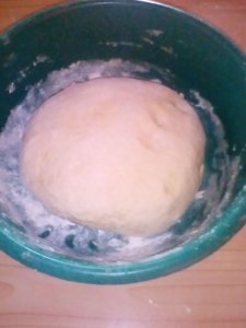 (Annyi lisztet adunk még hozzá,hogy jól tudjunk a tésztával bánni,ne ragadjon.)