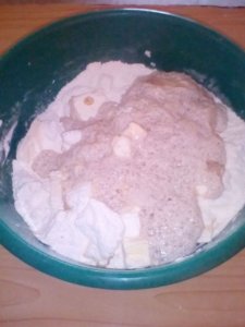 Hozzáadjuk a margarint,a tejfölt,és a felfuttatott élesztőt is.