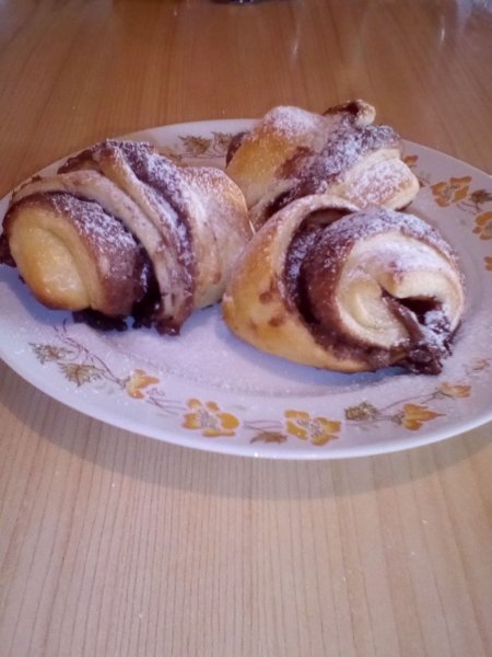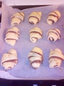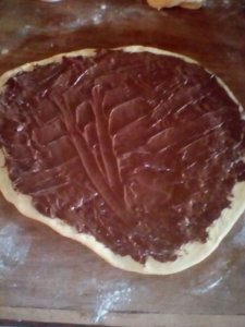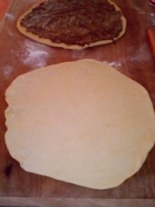 A másik kis cipót is kinyújtjuk vékony,kör alakúra,és ráhelyezzük a mogyorókrémmel megkent lapra.