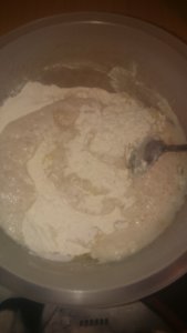 Az élesztőt a langyos tejben egy kevés cukorral felfuttatjuk.