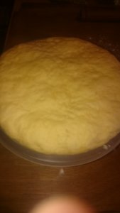 Lisztezett felületre borítjuk a megkelt tésztánkat.